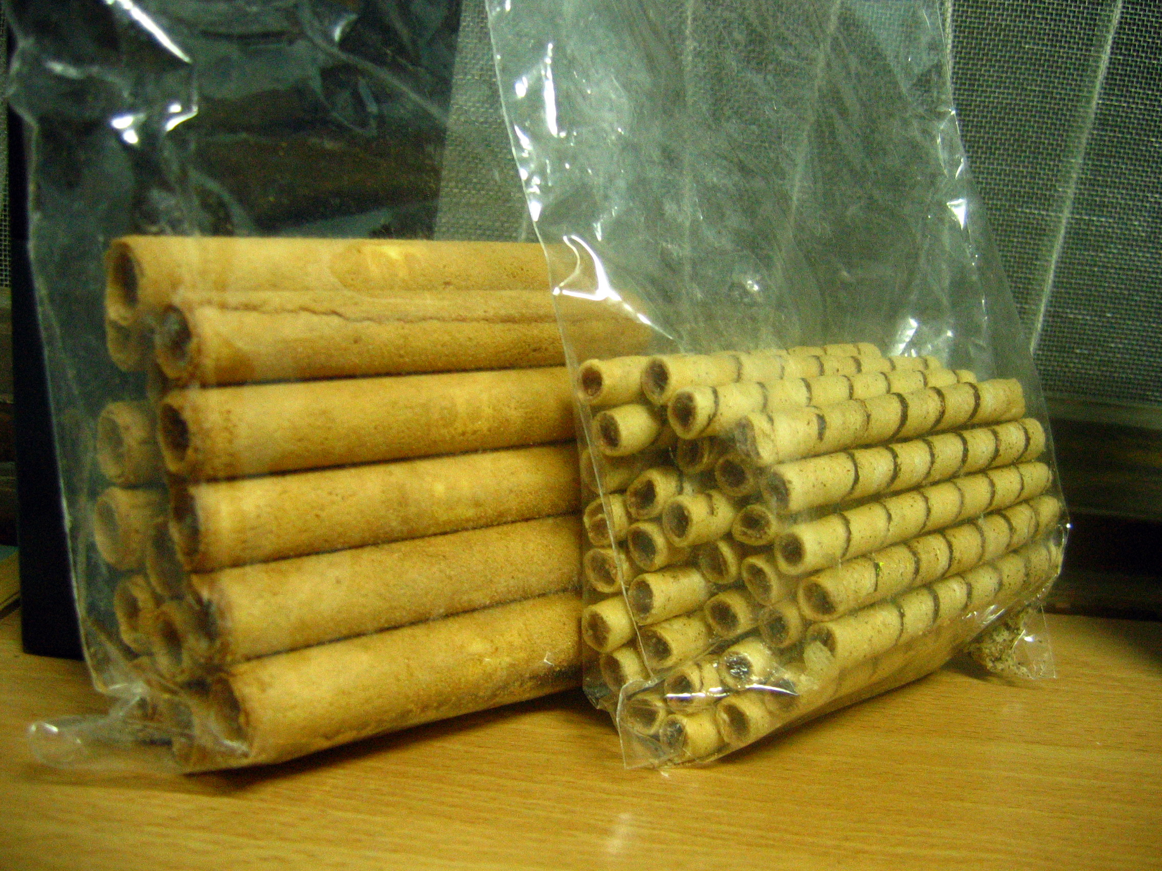 這是今天二姨帶來給我的餅乾,很好吃喔!左邊那袋是蛋捲,味道很香;右邊那袋有點像脆迪酥,裡面包的是巧克力。可惜我拿回家的時候淯茜腸胃炎只能吃一口,真是太可惜了。:P