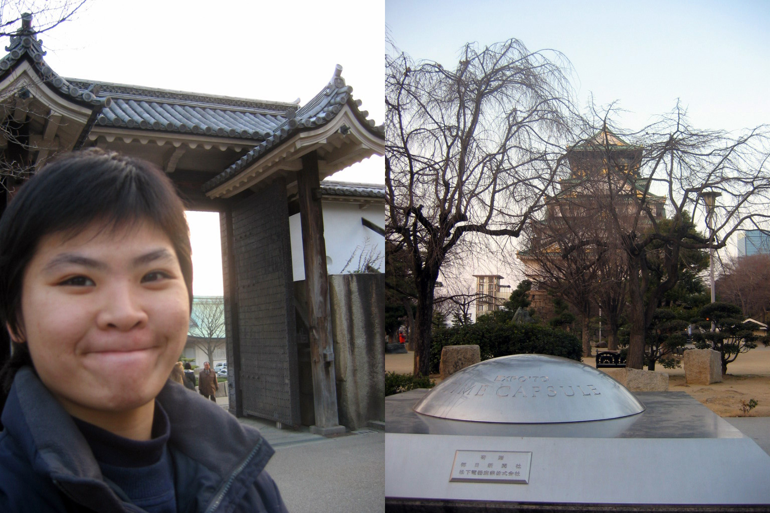 大家都很開心,笑起來的照片都亂嗨一把的。而且我每次自拍的時候都會被嘲笑說是只有我那台相機嘛。右邊的那個時空膠囊,是有一段故事的:時空膠囊(Time Capsule),是日本的兩大企業松下與每日新聞為了慶祝1970年萬國博覽會在大阪舉行,因此決定合力建造一座時空膠囊,讓後代的子孫能了解祖先過著什麼樣的生活型態。時空膠囊內共存放了2098項產品,舉凡日常生活用的上的,全都收藏在內(但並沒有交通工具那種大型物件)。構造上,共分上、下兩層,上層每一百年開一次,並且將收藏的物品替換為當時最新款的。下面那一層則是準備在五千年後,也就是西元6970年才會開放。